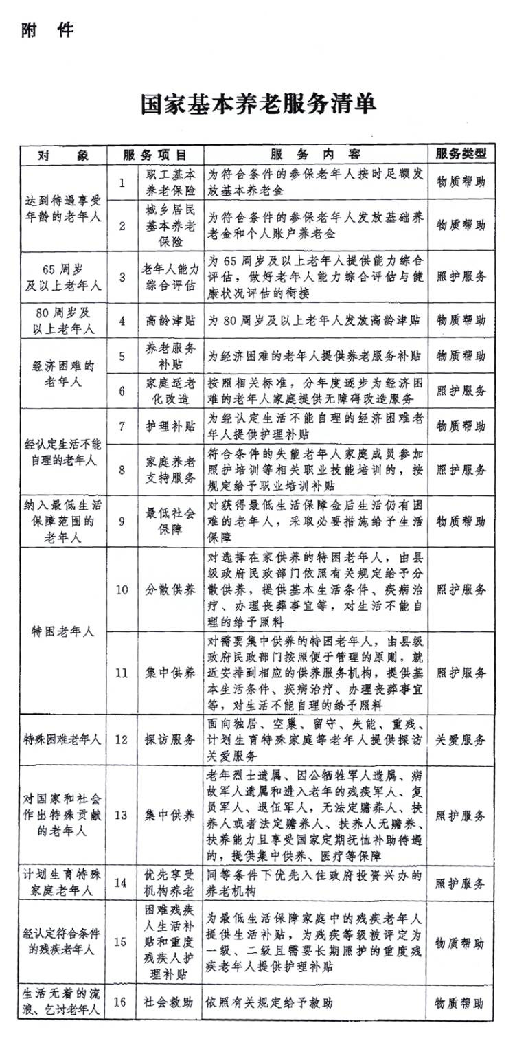 (一)制定落實基本養(yǎng)老服務(wù)清單。各地區(qū)各有關(guān)部門要嚴格落實《國家基本養(yǎng)老服務(wù)清單》(見附件)。《國家基本養(yǎng)老服務(wù)清單》明確的對象、項目、內(nèi)容等,根據(jù)經(jīng)濟社會發(fā)展水平、財力狀況等因素動態(tài)調(diào)整,由民政部會同相關(guān)部門適時提出修訂意見,按程序報批后以部門名義印發(fā)實施。省級政府應當對照《國家基本養(yǎng)老服務(wù)清單》制定并發(fā)布本地區(qū)基本養(yǎng)老服務(wù)具體實施方案及清單,明確具體服務(wù)對象、內(nèi)容、標準等,其清單應當包含《國家基本養(yǎng)老服務(wù)清單》中的服務(wù)項目,且覆蓋范圍和實現(xiàn)程度不得低于《國家基本養(yǎng)老服務(wù)清單》要求。到2025年,基本養(yǎng)老服務(wù)制度體系基本健全,基本養(yǎng)老服務(wù)清單不斷完善,服務(wù)對象、服務(wù)內(nèi)容、服務(wù)標準等清晰明確,服務(wù)供給、服務(wù)保障、服務(wù)監(jiān)管等機制不斷健全,基本養(yǎng)老服務(wù)體系覆蓋全體老年人。