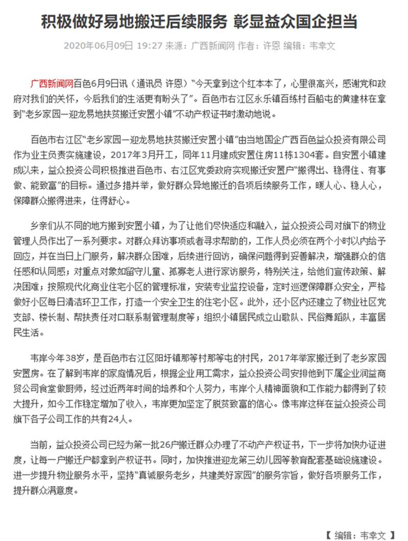 積極做好易地搬遷后續(xù)服務(wù) 彰顯益眾國(guó)企擔(dān)當(dāng)-廣西新聞網(wǎng)文章鏈接