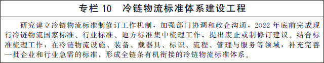 加強(qiáng)冷鏈物流標(biāo)準(zhǔn)制修訂。加強(qiáng)冷鏈基礎(chǔ)通用標(biāo)準(zhǔn)和冷鏈基礎(chǔ)設(shè)施、技術(shù)裝備、作業(yè)流程、信息追溯等重點(diǎn)環(huán)節(jié)以及冷鏈物流綠色化、智慧化等重點(diǎn)領(lǐng)域標(biāo)準(zhǔn)制修訂,加快填補(bǔ)標(biāo)準(zhǔn)空白。制定一批強(qiáng)制性國家標(biāo)準(zhǔn),守好冷鏈產(chǎn)品安全底線。加強(qiáng)冷鏈物流推薦性國家標(biāo)準(zhǔn)、行業(yè)標(biāo)準(zhǔn)推陳出新,支持地方因地制宜制定符合發(fā)展需要的地方標(biāo)準(zhǔn),鼓勵(lì)高起點(diǎn)制定團(tuán)體標(biāo)準(zhǔn)和企業(yè)標(biāo)準(zhǔn)。積極參與冷鏈物流國際標(biāo)準(zhǔn)化活動(dòng),推動(dòng)國內(nèi)國際標(biāo)準(zhǔn)接軌。