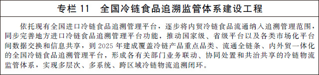 加快建設(shè)全國性冷鏈物流追溯監(jiān)管平臺,完善全鏈條監(jiān)管機(jī)制,針對冷鏈物流環(huán)境、主要作業(yè)環(huán)節(jié)、設(shè)施設(shè)備管理等重點(diǎn),規(guī)范實(shí)時(shí)監(jiān)測、及時(shí)處置、評估反饋等監(jiān)管過程,逐步分類實(shí)現(xiàn)全程可視可控、可溯源、可追查。創(chuàng)新監(jiān)管手段,加大現(xiàn)代信息技術(shù)和設(shè)施設(shè)備應(yīng)用力度,強(qiáng)化現(xiàn)場和非現(xiàn)場監(jiān)管方式有機(jī)結(jié)合。借鑒新冠肺炎疫情防控期間進(jìn)口冷鏈?zhǔn)称窓z驗(yàn)檢測檢疫經(jīng)驗(yàn)做法,優(yōu)化完善工作機(jī)制,建立科學(xué)、可靠、高效的冷鏈物流檢驗(yàn)檢測檢疫體系。