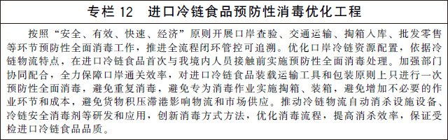 健全檢驗(yàn)檢測檢疫體系。適應(yīng)不同農(nóng)產(chǎn)品檢驗(yàn)檢測檢疫要求,完善覆蓋從種養(yǎng)殖、加工到銷售終端全鏈條以及冷鏈物流包裝、運(yùn)載工具、作業(yè)環(huán)境等全要素的檢驗(yàn)檢測檢疫體系。加強(qiáng)檢驗(yàn)檢測檢疫設(shè)施建設(shè)和設(shè)備配置,完善應(yīng)急檢驗(yàn)檢測檢疫預(yù)案,實(shí)行閉環(huán)式疫情防控管理,防范非洲豬瘟、新冠肺炎、禽流感等疫情擴(kuò)散風(fēng)險(xiǎn),提高重大公共衛(wèi)生事件等應(yīng)急處置能力。