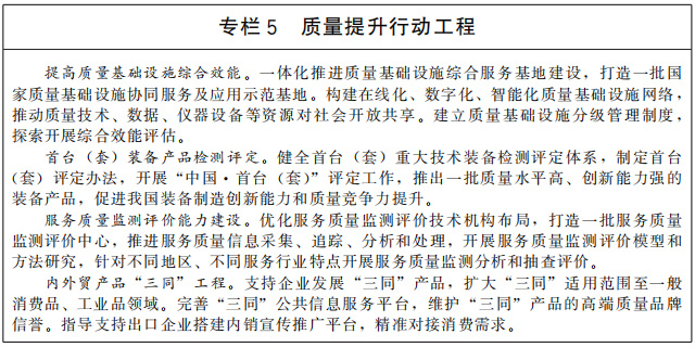 完善質(zhì)量管理制度。建立健全質(zhì)量統(tǒng)計監(jiān)測體系,開展高質(zhì)量發(fā)展綜合績效評價,完善質(zhì)量安全與質(zhì)量發(fā)展監(jiān)測指標。完善質(zhì)量激勵政策,開展中國質(zhì)量獎評選表彰活動,建立政府質(zhì)量獎獲獎企業(yè)和個人先進質(zhì)量管理經(jīng)驗宣傳推廣機制,引導各行業(yè)加強全面質(zhì)量管理。完善質(zhì)量提升資金多元籌集和保障機制,加強對質(zhì)量創(chuàng)新和質(zhì)量提升的支持。